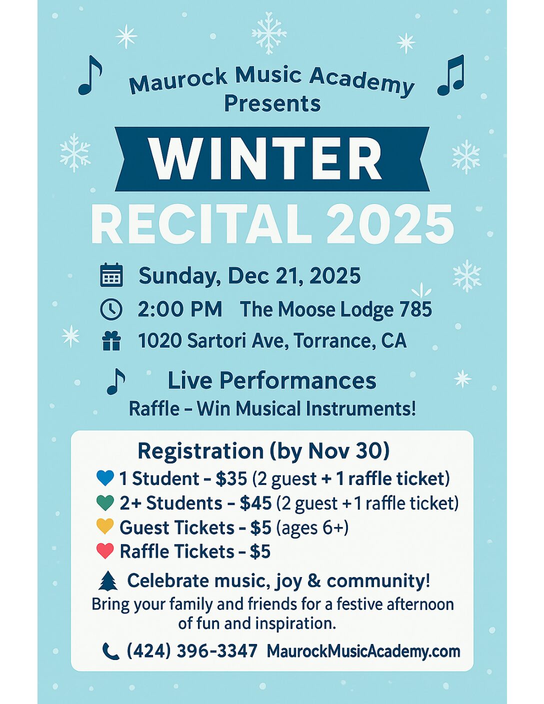 Don’t miss out on the chance to catch our Maurock Music Academy Bands live in action this Sunday, April 28th, at our Torrance location! π